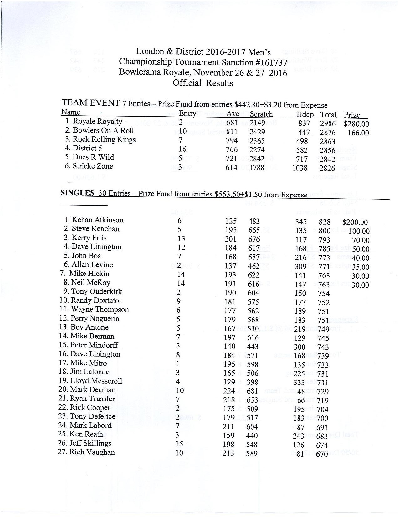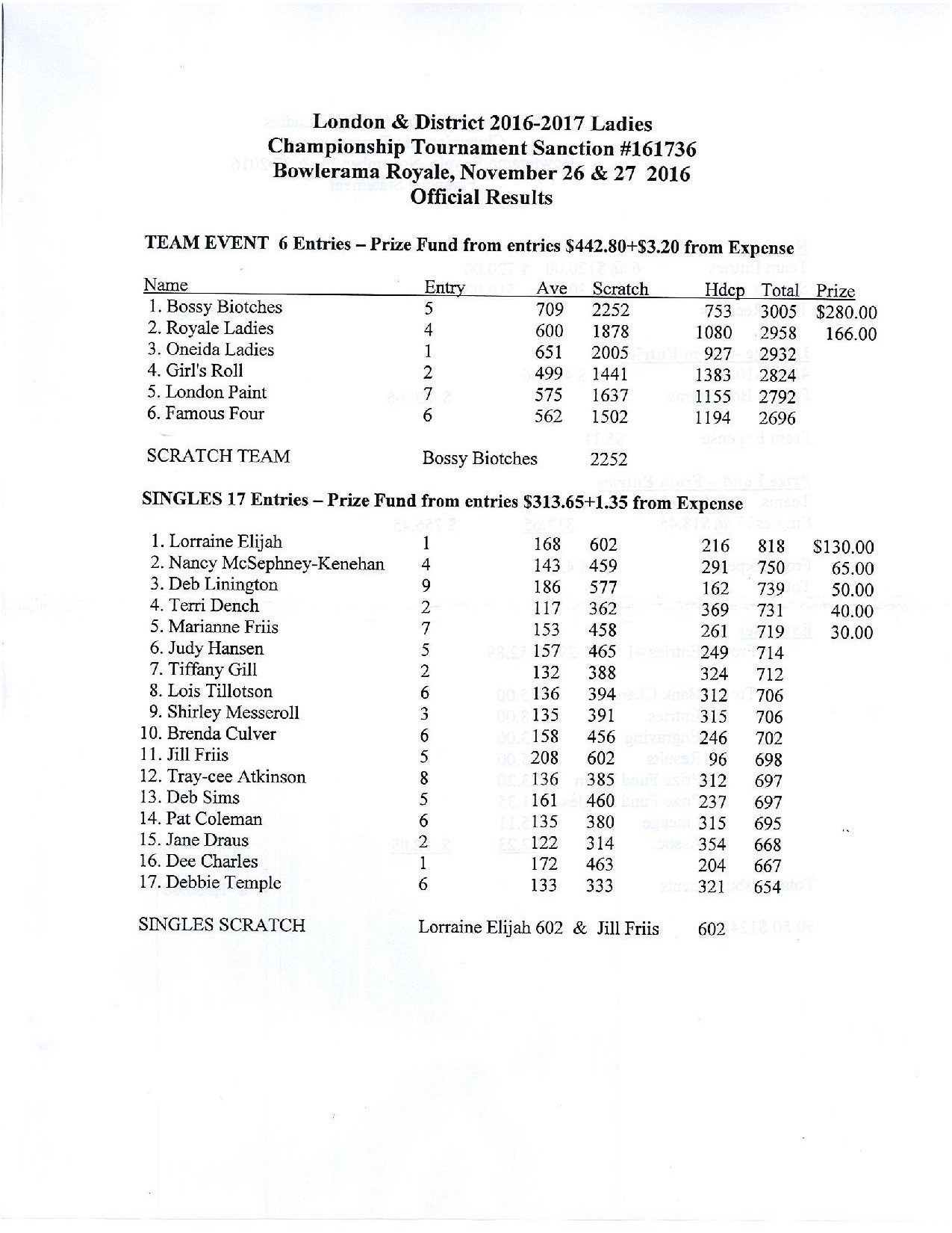 The 2016-2017 Men’s and Ladies’ Championships were held at Bowlerama Royale on November 26 & 27, 2016. Congratulations to our Prize winners!