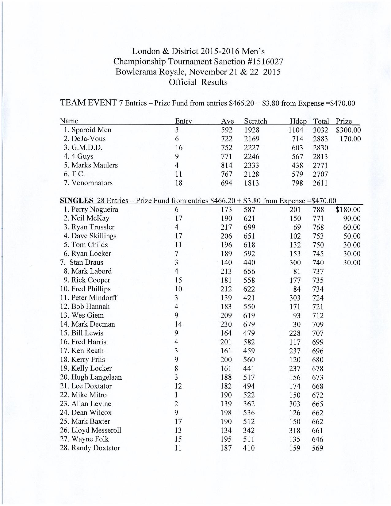 L&D 2015-2016 Mens’ Championship RESULTS